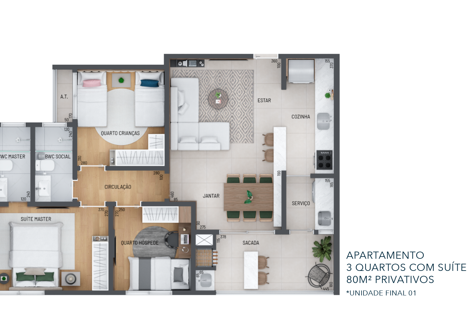 • Porcelanato acetinado entregue na sala, varanda, cozinha, área de serviço e banheiros.
